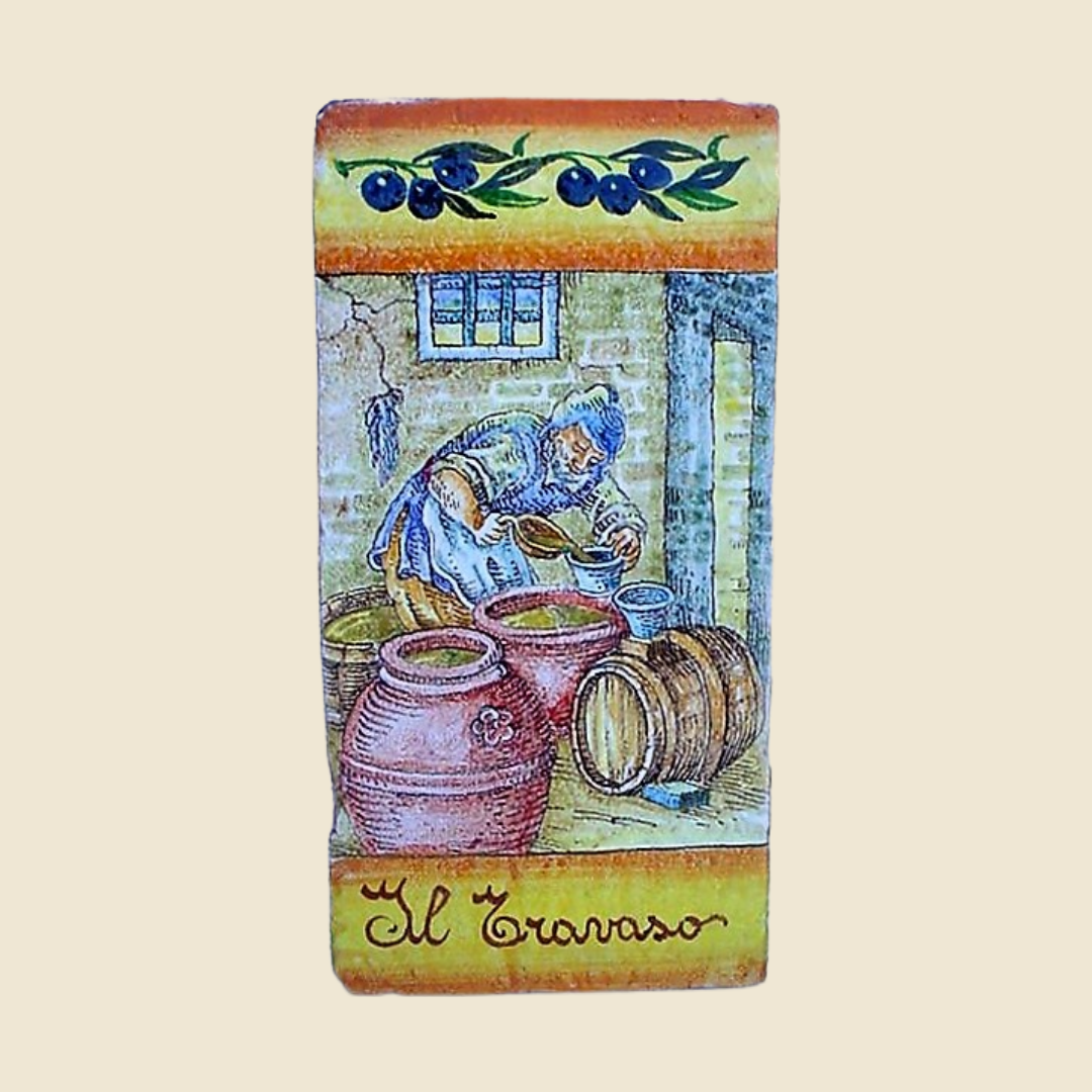 Rectangular tile, commonly called pianella - the brick usually used to pave rural structures typical of the Tuscan countryside. Tuscan terracotta, especially from the Impruneta area, is highly appreciated and known for its waterproof characteristics and resistance to low temperatures, as well as its beautiful terracotta shades; makes it unique, recognizable and highly sought after. We use this suffix, with its irregularities, veins, at first glance imperfections of handmade terracotta; to create artefacts with classic decorations, which come from distant times and places; but it is precisely thanks to these irregularities that our products take on a worn, lived-in appearance that smells of antiquity; these imperfections are like scars that make every single product unique and unrepeatable. The history of wine is summarized in 4 representations, ranging from harvesting, to pressing, to pressing and finally the drinker who becomes inebriated with this elixir produced by expert hands.