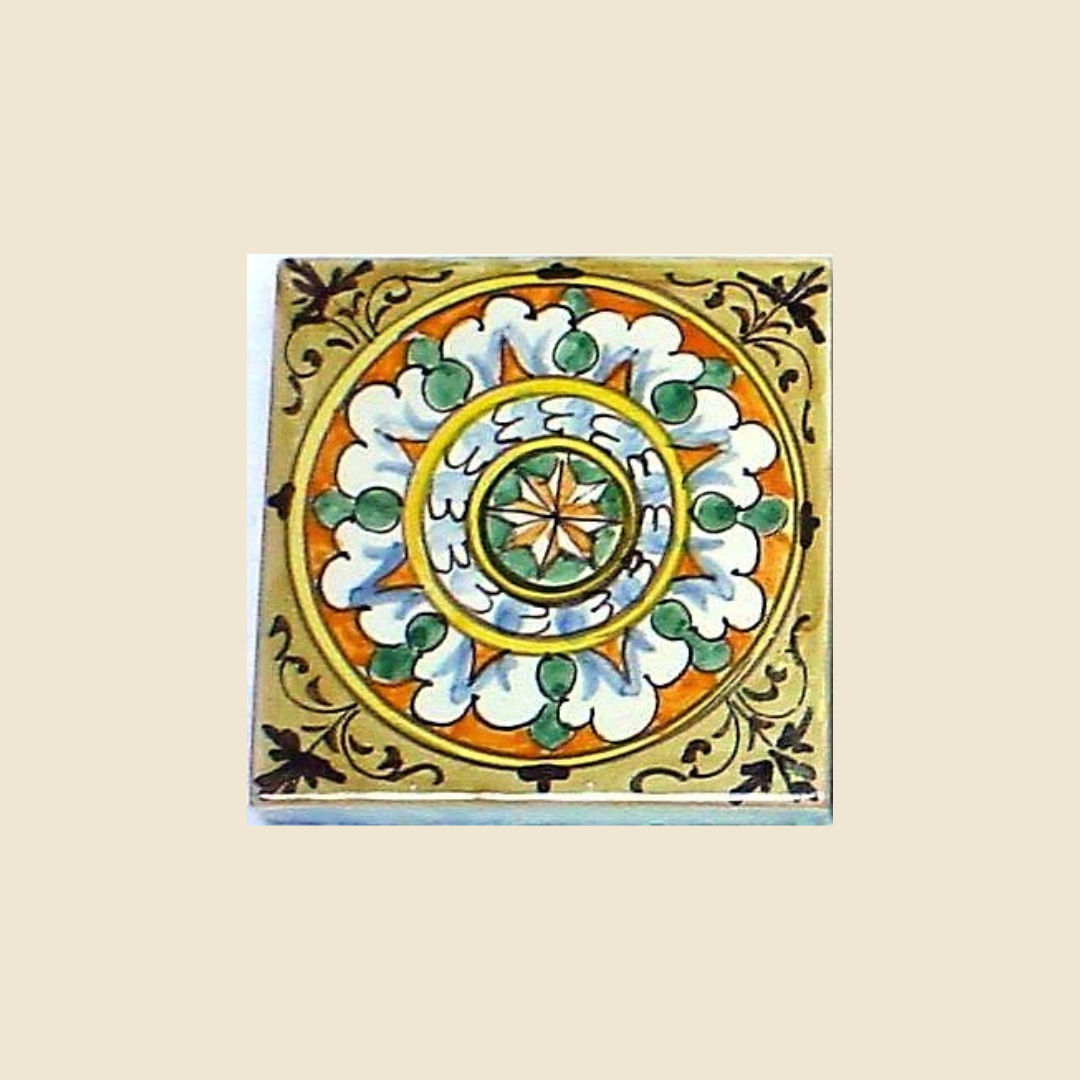 Handmade tile decorated with colorful popular geometries. In the traditional ceramics of Montelupo Fiorentino, dating back to the 13th and 14th centuries, we often find popular geometric decorations. Our proximity to Montelupo Fiorentino could only influence our production. These decorations are reworkings of ancient decorations, transformed and brought closer to contemporary tastes, using brighter and more intense colours; but keeping alive the typical designs and motifs of Montelupo Fiorentino.