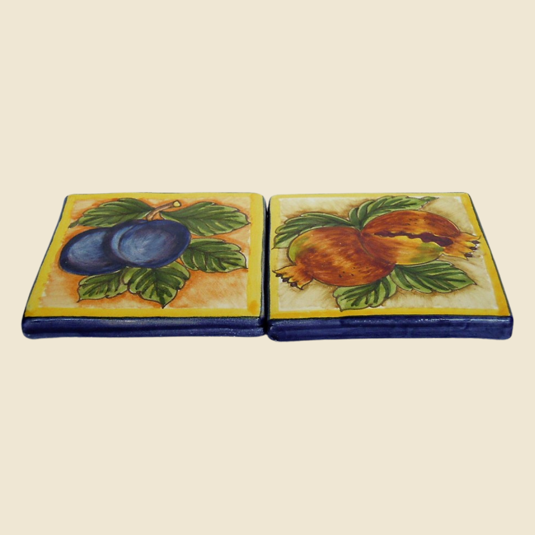 Handmade tile decorated with a fruit motif. Fruit in general has always been a popular subject for ceramics, in particular it goes very well with the rustic environments of farmhouses in the Tuscan countryside; they are often used to embellish environments that have a close relationship with food; such as a kitchen, a cellar or a living room. Fruit always brings a note of color and joy to our homes. Masonry kitchens in particular are often covered with monochrome tiles with some others decorated with various subjects.