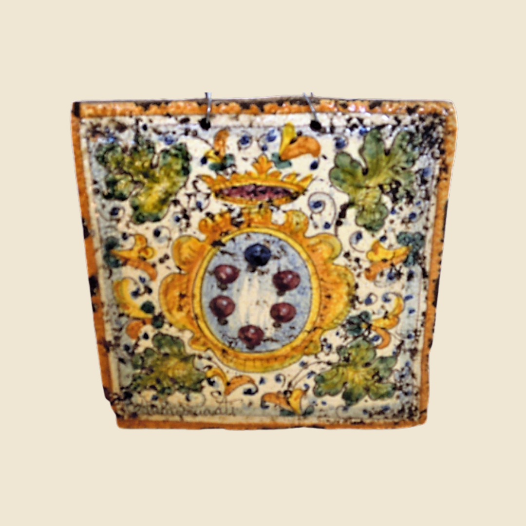 The leaves were elegantly intertwined, creating a harmonious pattern that framed the central coat of arms. Handcrafted tiles with carefully decorated details, showing subtle veins and delicate curves that give depth to the entire composition. The coat of arms, in the centre, shines with bright colours, a symbol of tradition and craftsmanship. Each element of the tile tells a story, uniting past and present in a timeless work of art, perfect for adorning both classic and modern environments.