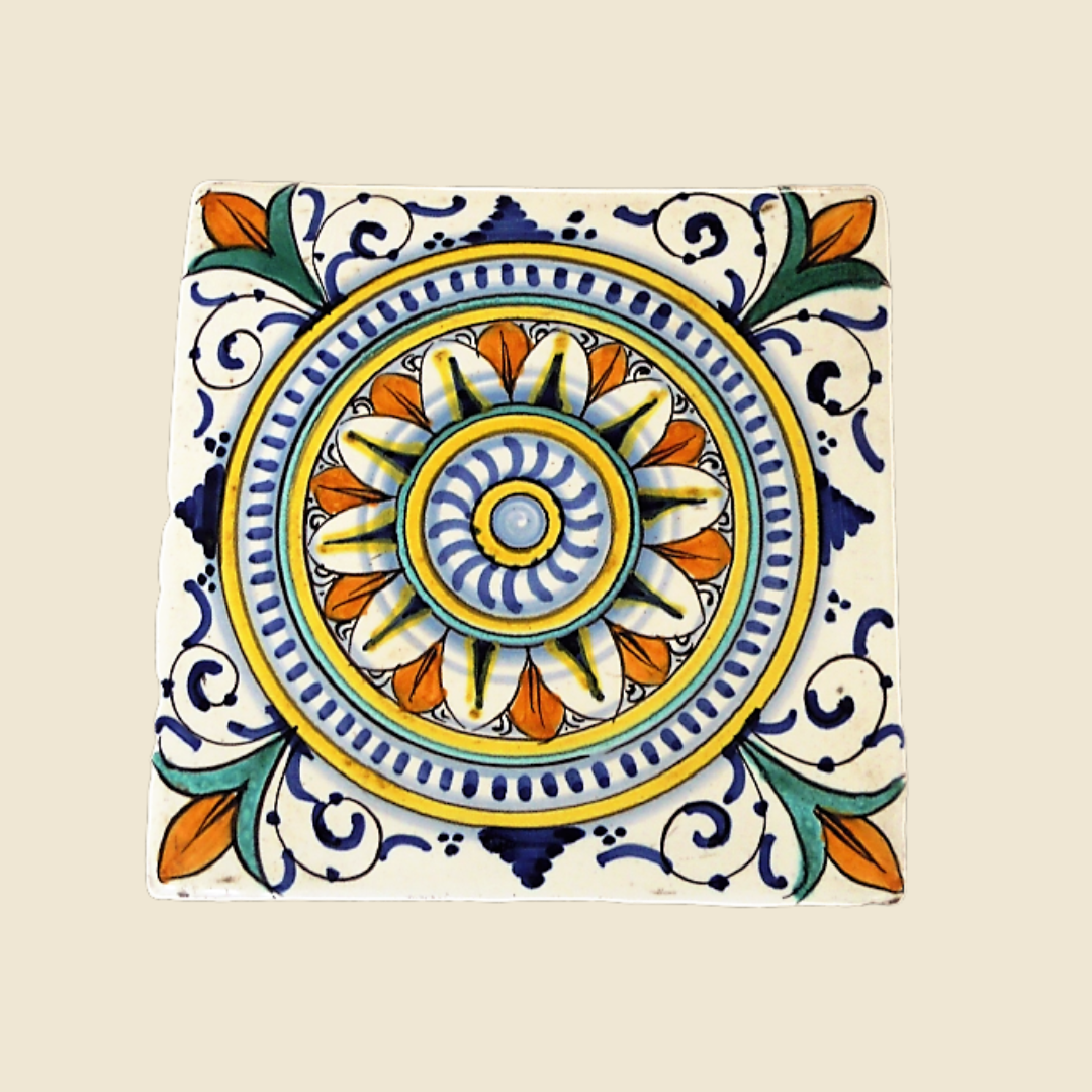 Hand-decorated artistic tile with colorful geometric patterns, captures the attention of anyone who observes it. Every line and curve seems to tell a story, combining tradition and creativity. The bright colors intertwine in perfect harmony, evoking a sense of warmth and welcome. This tile is not just a decorative element, but a work of art that transforms any space into a place of beauty and inspiration. Perfect for embellishing a kitchen, a bathroom or even a small corner of the living room, it adds a touch of personality and unparalleled style.